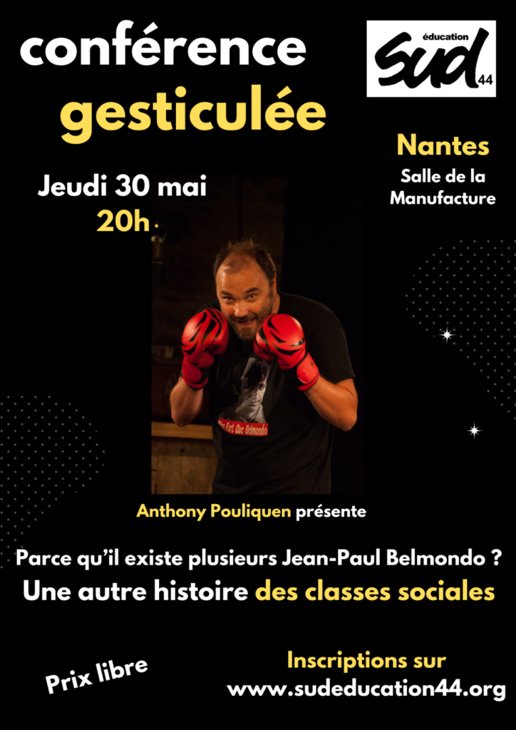 Parce qu’il existe plusieurs Jean-Paul Belmondo ? Une autre histoire des classes sociales. Une conférence gesticulée de et par Anthony Pouliquen avec la complicité de Cécile Delhommeau.