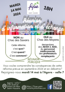 A 18h30, ce jeudi 16 mai, des représentant.es du collectif Parents d'élèves du 44 et des organisations syndicales des personnels ainsi que du Syndicat National des Lycéens rencontrent la FCPE pour coordonner les actions à venir et faire bloc contre le Choc des Savoirs.