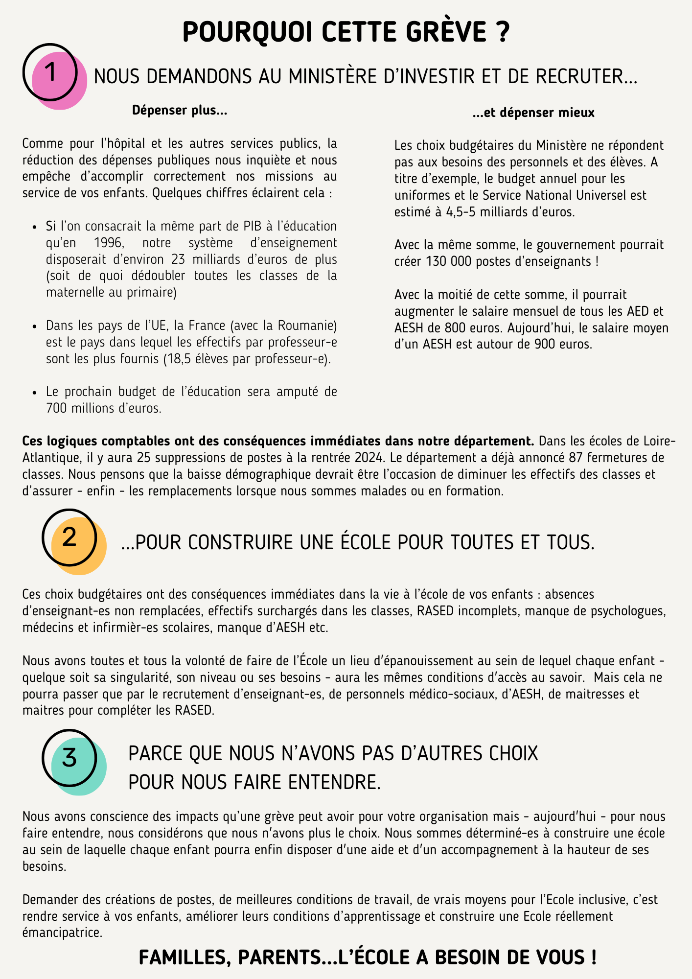 - Pour la création massive de postes afin de baisser les effectifs et assurer les remplacements (Dans l'Académie de Nantes, le ministère a annoncé pour la rentrée prochaine la suppression de 73 postes dans les collèges/lycées et de 92 postes dans les Écoles (25 pour le 44). Comment pourrait-on accepter de telles mesures ?)