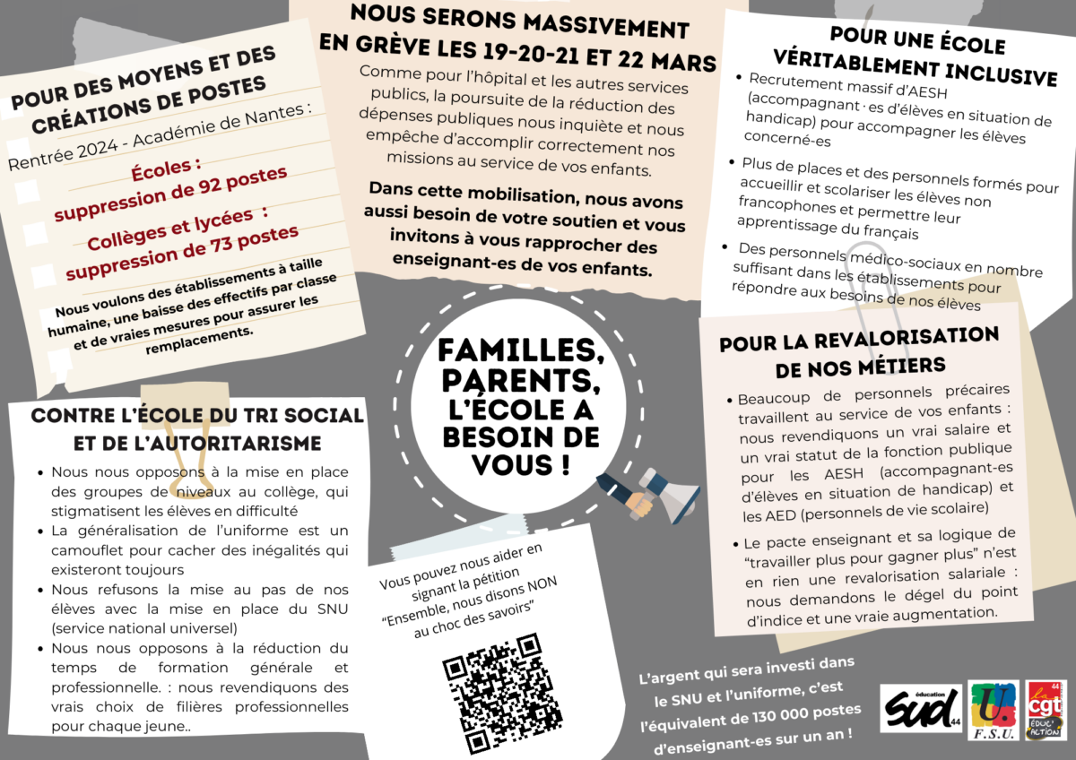 La semaine de mobilisation du 19 au 22 mars a été un succès : des taux de grévistes importants, plusieurs écoles qui affichent 100% de grévistes plusieurs jours de suite, des collèges et des lycées en action et très mobilisés... Surtout, l'alliance qui s'est forgée avec les parents d'élève est puissante ! En témoigne les 3 000 personnes réunies en manifestation ce samedi à Nantes. Renforçons-la, car il s'agit bien là d'une condition essentielle pour gagner !
