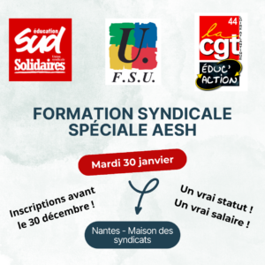 Pour donner suite à la soirée publique "AESH stop mépris" du 28 novembre qui a réuni plus de 60 personnes et pour construire ensemble les suites de la lutte, une journée de stage pour le personnel AESH est organisée par l'intersyndicale éducation du 44 (CGT, FSU, SUD) le mardi 30 janvier à la maison des syndicats à Nantes.